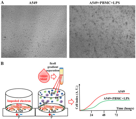 (A) Representative photomicrographs of untreated A549 cells and coculture A549 cells with PBMC activated by LPS after 24 h. Images acquired with 4x magnification through CELENA® S Digital Imaging System (Logos Biosystems). (B) Experimental design. DC—dendritic cells; MP—macrophages; Lmp—lymphocytes.