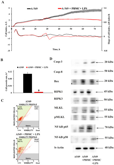 Assessment of A549 proliferation and cell death after 24-h impact of activated PBMC. (A) Real-time curve of cell index for A549 and (B) the cell growth rate measured with the RTCA iCELLigence over 55–70 h. A549 cells were seeded on the special detection plate and independence electron flow was detected and recalculated in cell index. (C) A549 death in the model conditions using Muse® Count & Viability kit. A549 cells were collected 24 h after cocultivation with activated PBMC, and the viable cells were detected using the MUSE Cell Analyzer (Merck Millipore, Burlington, MA, USA). (D) Representative immunoblots for markers of PANoptosis cell death in A549. Actin staining was used as a loading control. Number of individual cultures for experiments was 3. Results are indicated as mean ± SEM; * p < 0.05, an unpaired Welch-corrected t-test was used.