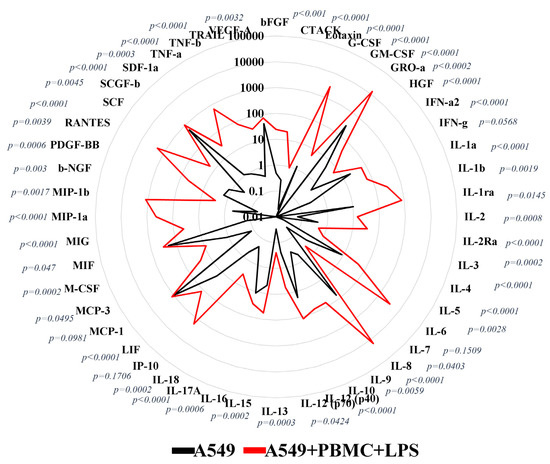 Analysis of the cytokine profile in a conditioned medium 24 h after cocultivation of A549 cells with activated PBMC showed the formation of a pro-inflammatory microenvironment due to an increase in the concentration of cytokines and chemokines produced by leukocytes. We found a strongly elevated level in 40 of the 48 measured analytes (Figure 3), of which IFN-α (p < 0.0001), IL-1α (p < 0.0001) IL-6 (p = 0.0028), and TNF-α (p = 0.0003) should be noted as being considered more important in the initiation of a cytokine storm compared to the control conditioned medium of A549 cells [29]. The increased release of these factors in the model system was higher than in the culture medium obtained from PBMC or A549 cells treated with LPS and cultivated separately (Figure S2). Thus, the secretome obtained from the combined cultures of A549 cells and PBMC in the presence of LPS turned out to be enriched with cytokines, representative of both humoral and cell-mediated immunity, which resembles the infectious pathology of COVID-19 in humans [30].