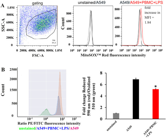 Effect of cocultivation with activated PBMC on ROS generation in A549 cells. (A) Evaluation of mitochondrial ROS production by MitoSOXTM Red. The left figure illustrates flow-cytometric dot plots showing gating of A549 cells. The central figure shows a histogram of cytometric analysis of MitoSOXTM Red on A549 cells unstained (gray) and intact A549 cells were stained with MitoSOXTM Red (black). The right figure shows a histogram of cytometric analysis of MitoSOXTM Red on intact A549 cells (black) and A549 cells were collected 24 h after the modeling of inflammation (red). (B) Red/green fluorescence intensity ratio, indicating an increase in lipid peroxidation in A549 cells estimated by Image-iT™ Lipid Peroxidation Kit. Histograms represent the ratio of red to green in A549 cells. Data are presented as a mean ± SEM, n = 3. * p < 0.05 vs. A549 as determined by t-test. MFI—mean fluorescence intensity.