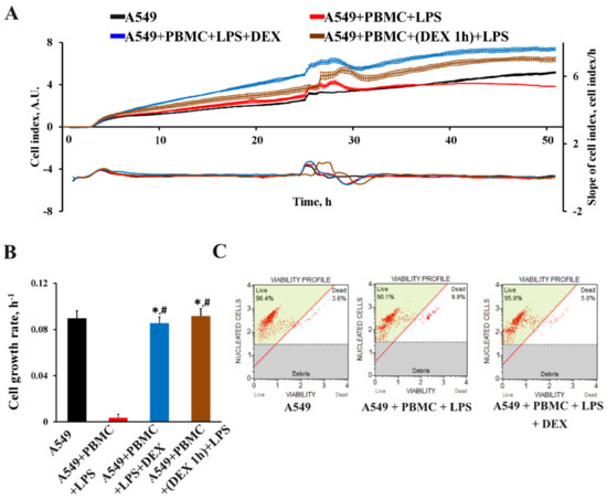 The effect of dexamethasone on the cell index and death of A549 cells within 24 h in a model system. The real-time curve of cell index for A549 cells (A) and quantification of the cell growth rate (B) measured using the RTCA iCELLigence for 35–50 h. (C) Cell death of A549 cells estimated using the Muse® Count & Viability kit. A549 cells were collected 24 h after cocultivation with activated PBMC, and the viable cells were estimated using the MUSE Cell Analyzer (Merck Millipore, Burlington, MA, USA). The data are presented as a mean ± SEM, n = 3. * p < 0.05 vs. A549 + PBMC + LPS, # p < 0.05 vs. A549 cells as determined by one-way ANOVA with Tukey’s multiple comparisons test.