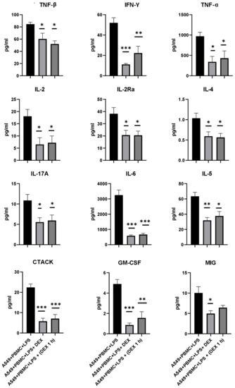 Effect of dexamethasone on cytokine/chemokine concentrations in the conditioned medium from the model system after 24 h treatment. The data are presented as a mean ± SEM, n = 3. * p < 0.05, ** p < 0.01, *** p < 0.001; the significance from the A549 + PBMC + LPS is assessed by a one-way ANOVA with the Tukey’s multiple comparisons test.