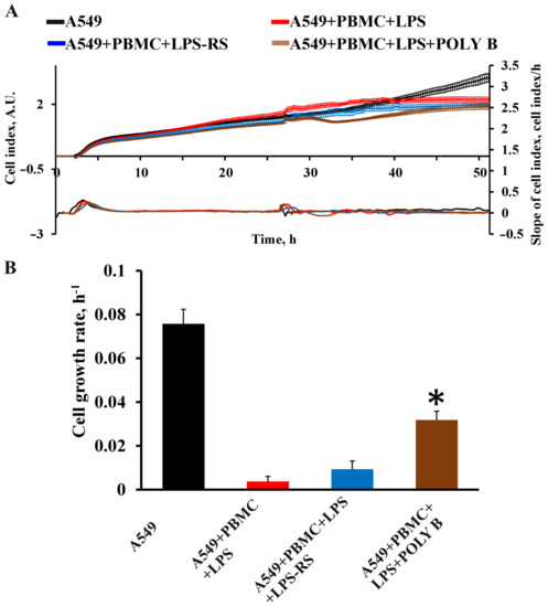 The viability of intact A549 cells and those cocultured with PBMC exposed to LPS was assessed by monitoring the cell index in real time using an iCELLigence device. We found that untreated A549 cells characterized by fast proliferation exceeded the cell growth rate of A549 cells cocultured with LPS-treated PBMC by more than 10-fold (Figure 2A,B). The cell growth rate analysis measured as the slope of cell index increment showed a dramatic decrease of the growth of A549 cells after co-cultivation with LPS-treated PBMC, whereas A549 cells treated with LPS or PBMC alone showed no significant change in cell index compared to unexposed A549 cells (Figure S1).