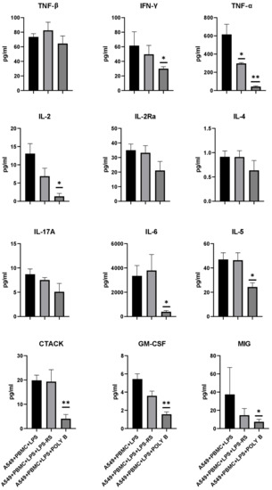 Influence of LPS-RS and polymyxin B on cytokine/chemokine concentrations in conditioned medium from the model system after 24 h treatment. Data are presented as a mean ± SEM, n = 3. * p < 0.05, ** p < 0.01; significance from the A549 + PBMC + LPS is assessed by one-way ANOVA with Tukey’s multiple comparisons test.