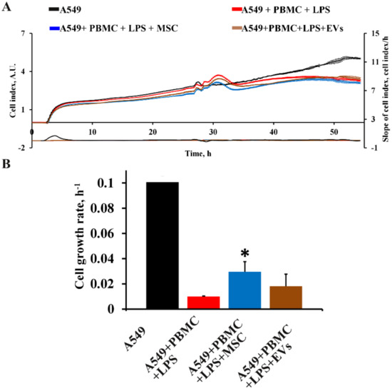The effect of MSC and EVs on proliferation of A549 cells for 24 h in a model system. (A) The real-time curve of cell index for A549 cells and (B) the cell growth rate measured using RTCA iCELLigence for 35–50 h. The data are presented as a mean ± SEM, n = 3. * p < 0.05 vs. A549 + PBMC + LPS as determined by a one-way ANOVA with Tukey’s multiple comparison test.
