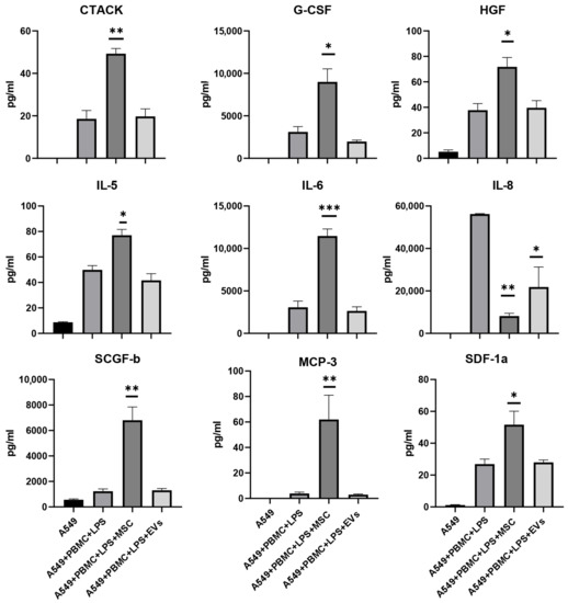 To unravel the protective mechanisms of MSC and EVs, we conducted a Bio-plex analysis of the conditioned medium. The results of the analysis of the cytokine profile in the group of cocultivation with MSC showed the impossibility of unambiguous interpretation of the data as a shift towards the anti-inflammatory state. Conditioned medium contained both pro-inflammatory and anti-inflammatory cytokine/chemokines, e.g., the levels of CTACK, IL-5, and IL-6 were increased by more than two times while the levels of anti-inflammatory cytokine IL-8 decreased by more than two times in the presence of either MSC or EVs (Figure 10). Interestingly, only after cocultivation with MSC we found an increase in growth factors such as HGF (1.8 times), G-CSF (2.5 times), and SCGF-b (3 times), as well as chemokines MCP-3 (16 times) and SDF-1α (2 times), as compared with the A549 + PBMC + LPS group (Figure 10). The concentration of other analytes has not changed significantly (Figure S5). Thus, the results do not allow us to unambiguously interpret therapeutic effects of MSC in the model system.