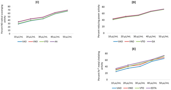 Figure 4A–E represent the antioxidant activity of tested essential oils in terms of their IC50 values. In the DPPH assay, the reduction of the stable radical DPPH (violet) to the yellow-colored DPPH-H is employed to measure the potential of an antioxidant molecule to act as a donor of hydrogen atoms or electrons. Figure 4A shows that VNO reduced DPPH with an IC50 value of 23.16 ± 0.5 µL/mL, which is close to the standard antioxidant taken for the assay, BHT (18.84 ± 0.6 µL/mL). VAO and VTO displayed moderate and weak antioxidant activity, with IC50 25.39 ± 0.0 µL/mL and 32.49 ± 0.5 µL/mL, respectively. H2O2 can cross the biological membrane, and as a result it can damage the human body by forming reactive OH· radicals following Fenton reaction [65]. In H2O2 radical scavenging assay, VAO (IC50 = 24.49 ± 0.1 µL/mL) displayed good scavenging activity when compared to the standard, ascorbic acid (28.33 ± 0.5 µL/mL), followed by VNO (32.38 ± 0.5 µL/mL) and VTO (34.30 ± 0.5 µL/mL). The extent of nitrite scavenging by the samples was compared with ascorbic acid and showed IC50 values as: ascorbic acid (24.49 ± 0.1 µL/mL) > VNO (27.58 ± 0.1 µL/mL) > VTO (32.27 ± 0.1 µL/mL) > VAO (32.95 ± 0.5 µL/mL). The reducing power of a compound is related to its ability to transfer electrons, which indicates its significant antioxidant potential. As shown in Figure 4D, VNO displayed good reducing capability (RP50 = 19.05 ± 0.6 μL/mL) that is very close and lower than that of the standard gallic acid (20.22 ± 0.4 μL/mL). The order of RP50 values for different samples is in the order: VNO (19.05 ± 0.6 μL/mL) > gallic acid (20.22 ± 0.4 μL/mL) > VAO (20.97 ± 0.5 μL/mL) > VTO (22.74 ± 0.7 μL/mL). In auto-oxidation reactions, metal ion is a powerful catalyst as it can inhibit the generation of oxygen radicals. The IC50 values of different samples and standards towards their antioxidant potentiality in terms of chelating ability were observed as: Na2-EDTA (IC50 = 26.23 ± 0.26 µL/mL) > VTO (IC50 = 29.77 ± 0.2 µL/mL) > VNO (IC50 = 31.18 ± 0.2 µL/mL) > VAO (IC50 = 36.60 ± 0.1 µL/mL).