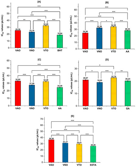 (A–E) Antioxidant activity in terms of IC50 values (µL/mL) for VAO, VNO, and VTO, (A) DPPH radical scavenging, (B) H2O2 radical scavenging, (C) NO radical scavenging, (D) reducing power activity, (E) Metal chelating activity. Statistically significant differences were examined using one-way ANOVA and Tukey posthoc tests. *** p < 0.001, ** p < 0.005, * p < 0.05 above columns indicate significant differences between treated groups. Values are mean ± SD, n = 3.