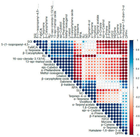 Pearson’s correlation coefficient of major essential oil constituents (>2.00%) and antioxidant and herbicidal activities of Vitex species revealed that 5-(1-isopropenyl-4,5-dimethylbicyclo[4.3.0]nonan-5-yl)-3-methyl-2-pentenol acetate and β-caryophyllene strong positive correlation with DPPH radical scavenging activity and Fe2+ metal chelating activity, whereas γ-terpinene was also found positively correlated with Fe2+ metal chelating activity. Dahham et al. [77] also reported significant DPPH scavenging activity of β-caryophyllene. α-terpinyl acetate, 1,8-cineole and epi-α-cadinol, α-pinene, and β-farnesene showed moderate correlation with H2O2 radical scavenging activity. Terpinen-4-ol, α-terpinene, and viridiflorol showed moderate correlation with NO radical scavenging activity, as well as reducing power activity. The terpinen-4-ol was also reported to induce relaxation and was unlikely to be mediated by induction of NO release in rabbit duodenum relaxation in rabbit duodenum [78]. In terms of herbicidal activity of tested essential oils, 5-(1-isopropenyl-4,5-dimethylbicyclo[4.3.0]nonan-5-yl)-3-methyl-2-pentenol acetate and β-caryophyllene showed strong positive correlation with seed germination inhibition, whereas linalool and β-caryophyllene have moderated correlation with root length inhibition and terpinen-4-ol, α-terpinene, and viridiflorol were found to have strong positive correlation with shoot length inhibition. High β-caryophyllene-containing plants were also reported to have phytotoxic effects on weed species [79]. The correlation coefficient results were also supported by in vitro activities in presentation investigation, as well as previously reported studies. Pearson’s correlation coefficient representation of essential oil constituents with their biological activities is demonstrated in Figure 5.
