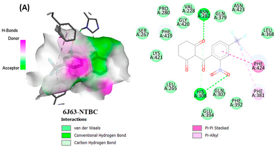 From in vitro studies, it was found that essential oils have potent antioxidant and phytotoxic activity. We also examined whether the major phytoconstituents from VAO, VNO, and VTO physically bind with antioxidant protein (human peroxiredoxin 5, PDB: 1HD2) and 4-hydroxyphenylpyruvate dioxygenase (HPPD, PDB: 6J63) receptors. The tested essential oils displayed good inhibition of the free radicals, for which the enzyme human peroxiredoxin 5 was selected, as it has broader activity against the reactive oxygen species (ROS) and is mostly involved in the stress protection mechanism [80,81]. The reason for selecting HPPD is that it is known to be the target protein for compounds with post-emergence herbicidal activity. In our results, the tested essential oils were found to have good post-emergence herbicidal activity against the receptor species, for which HPPD was selected as a target enzyme [18,38]. Among all selected phytocompounds, 13-epi-manoyl oxide demonstrated the best binding affinity with human peroxiredoxin 5 (−6.2 kcal mol) and HPPD (−8.7 kcal/mol). By introspecting the multiple dock poses, the best docked pose was selected as having the lowest binding energy. The best docked pose of 13-epi-manoyl oxide exhibited 2 pi-alkyl interaction, 1 pi-sigma interaction, and other Van der Waal interactions with 6J63 containing amino acid residues such as Phe A:424, Phe A:419, and Phe A:381, as represented in Figure 6B. Similarly, the best docked pose of 13-epi-manoyl oxide exhibited alkyl interaction with 1HD2 containing amino acid Ala A:90, Arg A:86, and exhibited Van der Waal interaction. For comparison purposes, a docking study of Nitisinone (CID:115355) was also performed with HPPD. Nitisinone (2-[2-nitro-4-(trifluoromethyl)benzoyl]cyclohexane-1,3-dione, (NTBC)) is a known inhibitor of HPPD. The docking study of ascorbic acid (CID:54670067), a known antioxidant, was performed with 1HD2. The binding energy for NTBC complexed with 6J63 was −8.9 kcal/mol, which is very close to that of 13-epi-manoyl oxide (−8.7 kcal/mol). On the other hand, binding energy of ascorbic acid complexed with 1HD2 came out to be −5.7 kcal/mol, which was higher than most of the compounds such as 13-epi-manoyl oxide (−6.2 kcal/mol), caryophyllene oxide (−6.1 kcal/mol), 5-(1-isopropenyl-4,5-dimethylbicyclo [4.3.0]nonan-5-yl)-3-methyl-2-pentenol acetate (−6.1 kcal/mol), β-caryophyllene (−6.0 kcal/mol), and viridiflorol (−5.9 kcal/mol), as shown in Figure 7. The lower values of binding free energy demonstrate more significant interaction between the receptor and the ligand. Our results were consistent with previous in silico studies reported by Alminderej et al. [73], where a phenylpropanoid-rich Piper cubeba EO gave similar results in terms of a proposed in vitro antioxidant activity by targeting human periredoxin 5. In this study, the compounds viridiflorol and caryophyllene oxide showed significant interaction with 1HD2 receptor as in the present study. In a recent study, focusing on the phytotoxic potential of Calycolpus goetheanus EO, it was found that the major components of the specimen, 1,8-cineole and β-caryophyllene interacted favorably with the HPPD protein [18]. These results are in general agreement with those obtained in the present study.