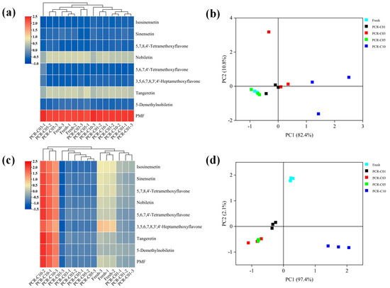 Multivariate statistical analysis of the PMFs in the PCR-C during storage. (a) HCA and (b) PCA of the bound PMFs in PCR-C (Fresh, PCR-C01, PCR-C03, PCR-C05, PCR-C10); (c) HCA and (d) PCA of the free PMFs in PCR-C (Fresh, PCR-C01, PCR-C03, PCR-C05, PCR-C10).