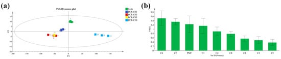 (a) PLS-DA of PCR-C samples and (b) variable importance in projection (VIP) score based on the free PMFs in PCR-C (Fresh, PCR-C01, PCR-C03, PCR-C05, PCR-C10). C1, isosinensetin; C2, sinensetin; C3, 5,7,8,4′-tetramethoxyflavone; C4, nobiletin; C5, 5,6,7,4′-tetramethoxyflavone; C6, 3,5,6,7,8,3′,4′-heptamethoxyflavone; C7, tangeretin; and C8, 5-demethylnobiletin.