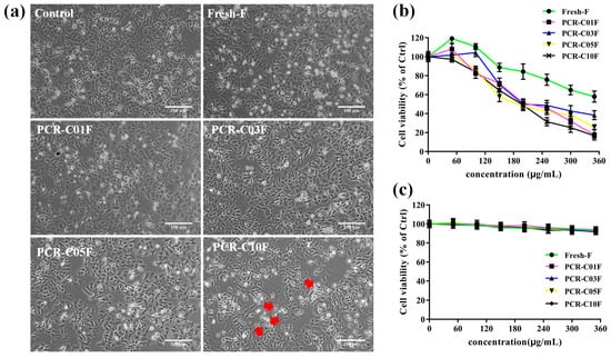 Growth inhibition effect of PCR-CF during storage on A549 cells. (a) Morphological changes of A549 cells that were treated with PCR-CF for 24 h under inverted phase-contrast microscopy (scale bar = 100 μm). (b) Viability of A549 cells and (c) MRC-5 cells that were treated with PCR-CF at the gradient concentrations (50, 100, 150, 200, 250, 300, and 350 µg/mL) for 24 h by MTT assay.