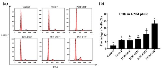 In order to determine whether PCR-CF inhibited cell growth via cell cycle arrest, the effect of PCR-CF at different storage periods on cell cycle arrest of A549 cells was investigated by flow cytometry with PI staining. As shown in Figure 4a, compared to the control group, the PCR-CF treatment group exhibited a significant induction on cell cycle arrest at the G2/M phase, which agreed with the previous report that tangeretin induced G2/M cell cycle arrest and apoptosis to suppress cell growth and to induce cell death in glioma cells []. The cell number at the G2/M cell cycle arrest phase ranked in descending order as follows: PCR-C10F > PCR-C05F > PCR-C03F > PCR-C01F > Fresh-F (Figure 4b). Such a change trend demonstrated that the cell cycle arrest that was induced by PCR-CF was enhanced during storage. The cell number at G2/M cell cycle arrest phase of PCR-C10F and PCR-C05F treatment group was significantly higher than that of the other PCR-CF treatment groups. In summary, PCR-CF inhibited cell growth by inducing G2/M phase cell cycle arrest of A549 cells and exhibited an enhanced effect with storage periods extended.