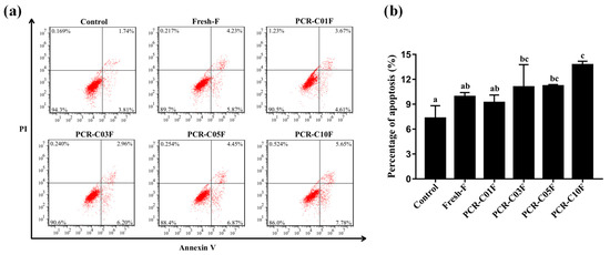 One previous study has revealed that the ethyl acetate extracts from sweet orange peel exert an antiproliferative effect on human hepatoma cells through cell cycle arrest and apoptosis induction []. In order to explore whether PCR-CF induced A549 cell apoptosis, flow cytometry assay with Annexin V-FITC/PI double staining was conducted. As shown in Figure 5a, compared to the control group, the PCR-CF treatment group exhibited a significant induction of apoptosis. The percentage of apoptosis that was induced by PCR-CF treatment ranked in descending order as follows: PCR-C10F > PCR-C05F > PCR-C03F > Fresh-F > PCR-C01F (Figure 5b). Compared with the PCR-CF at early storage periods, PCR-C10F significantly induced apoptosis of A549 cells, indicating higher apoptosis induction of PCR-C10F.