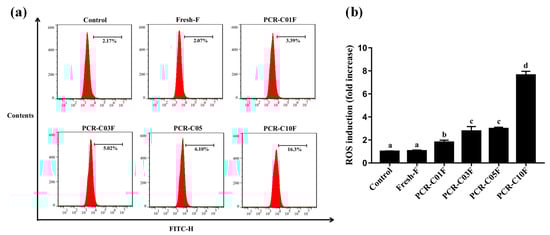 ROS accumulation that was induced by PCR-CF in A549 cells. (a) ROS generation in A549 cells was measured by flow cytometry after A549 cells were exposed to 200 µg/mL PCR-CF for 24 h followed by DCFH-DA staining. (b) Fluorescence intensity ratio of the treatment group to control group. The data were expressed as the means ± SD of the triplicates of each independent experiment. The different lowercase letters above the bars indicate a significant difference (p < 0.05) between the different groups through one-way ANOVA and Duncan’s multiple comparisons.
