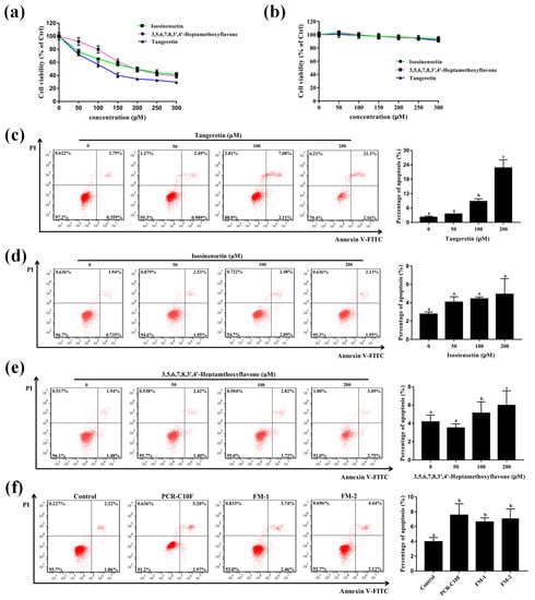 Growth of inhibition and apoptosis induction effect of the important PMFs in A549 cells. (a) Viability of A549 cells and (b) MRC-5 cells treated with the important PMFs at gradient concentrations (50, 100, 150, 200, 250, and 300 µM) for 24 h by MTT assay. The apoptosis induction effect of tangeretin (c), 3,5,6,7,8,3′,4′-Heptamethoxyflavone (d), and Isosinensetin (e) in A549 cells and the corresponding apoptosis rate of A549 cells (the early and late apoptosis). The apoptosis rate of A549 cells with or without 24-h PMFs (50, 100, and 200 µM) treatment followed by Annexin V-FITC/PI staining was measured by flow cytometry. (f) The apoptosis induction effect of PCR-C10F and the major active flavonoid mixture (FM) with the equivalent amount of PMFs to PCR-C10F. The data were expressed as the means ± SD of the triplicates of each independent experiment. The different lowercase letters above the bars indicate a significant difference (p < 0.05) between the different groups through one-way ANOVA and Duncan’s multiple comparisons.
