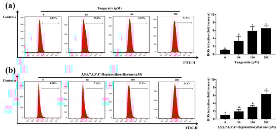 Crucial active PMFs-induced ROS accumulation of A549 cells. ROS generation was detected by flow cytometry after 24-h exposure to tangeretin (a) and 3,5,6,7,8,3′,4′-heptamethoxyflavone (b) followed by DCFH-DA staining. The fluorescence intensity ratio of the treatment group to the control group was calculated. The data were expressed as the means ± SD of the triplicates of each independent experiment. The different lowercase letters above the bars indicate a significant difference (p < 0.05) between the different groups through one-way ANOVA and Duncan’s multiple comparisons.