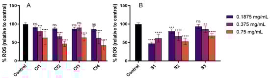 Cellular antioxidant capacity, expressed as % of ROS inhibition relative to the control, of each extract. (A) Codfish frame extracts; (B) Sardine wastes extracts. The results are expressed as mean ROS percentage relative to the control ± SD. The symbol * indicates significance relative to the control ** p-value ≤ 0.01, *** p-value ≤ 0.001, **** p-value ≤ 0.0001); ns—not significant.