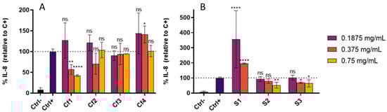 IL-8 secreted by HaCaT cells treated for 24 h with different extracts concentrations and 15 µg/mL LPS. (A) Codfish residues extracts; (B) Sardine residues extracts. Ctrl-—cells incubated with only culture media; Ctrl+—Cells incubated with culture media + inflammation inductor (LPS); Cf1, Cf2, Cf3, Cf4—cells incubated with the different extracts from codfish frames + inflammation inductor (LPS); S1, S2, S3—cells incubated with the different extracts from sardine wastes + inflammation inductor (LPS). The results are expressed as mean IL-8 percentage relative to the positive control ± SD. The symbol * indicates significance relative to the positive control (* p-value ≤ 0.05, ** p-value ≤ 0.01, **** p-value ≤ 0.0001); ns—not significant.