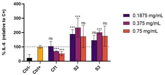 IL-6 secreted by HaCaT cells treated for 24 h with different extracts concentrations and 15 µg/mL LPS. Ctrl-—cells incubated with only culture media; Ctrl+—Cells incubated with culture media + inflammation inductor (LPS); Cf1– cells incubated with Cf1 extract from codfish frames + inflammation inductor (LPS); S2, S3—cells incubated S2 and S3 extracts from sardine wastes + inflammation inductor (LPS). The results are expressed as mean IL-6 percentage relatively to the positive control ± SD. The symbol * indicates significance relative to the positive control (*** p-value ≤ 0.001); ns—not significant.
