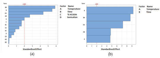 (a) Pareto chart of the total parameters analyzed (significative and not significative); and (b) Pareto chart of significative parameters only, i.e., temperature (A) and extraction time (B).