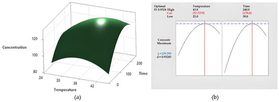 (a) Surface plot of phlorizin concentration cv time and temperature; and (b) multiple response prediction analysis.