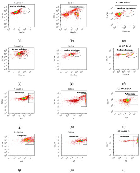 Magic Red® Caspase-3/7 Assay Kit contains Hoechst 33,342 stain (200 μg/mL) and acridine orange (AO, 1.0 µM). Hoechst 33,342 is a cell-permeant nuclear stain [57]; when it is linked to double-chain DNA, it emits blue fluorescence, highlighting condensed nuclei in apoptotic cells. Acridine orange is a chelating dye that can be used to reveal lysosomal activity [58]. Here, 300 µL of each cell culture was introduced in flow cytometry tubes; then, 2 µL of Hoechst 33,342 stain was added, and the cells were mixed well [53]. After these operations, 50 µL of 1.0 µM AO was added; the cells were incubated at room temperature into darkness for 30 min. After incubation, 1 mL FCB was added; the cells were examined at the flow cytometer under the following conditions: an excitation of 488 nm, the UV excitation, and blue emission for Hoechst 33,342 (VL2), and green emission acridine orange (BL1 channel) [53].