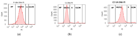A cell culture volume of 1 mL was washed in FCB, introduced in flow cytometry tubes, and fixed with 50 µL ethanol for 30 min [53]. Next, the cells were treated with PI (20 µg/mL) and RNase A (30 µg/mL) and incubated at room temperature, into darkness, for 30 min [53]. Then, 1 mL FCB was added, and the cell cycle distribution was detected at the flow cytometer in the following conditions: a 488 nm excitation and orange emission for PI (BL2 channel) [53].