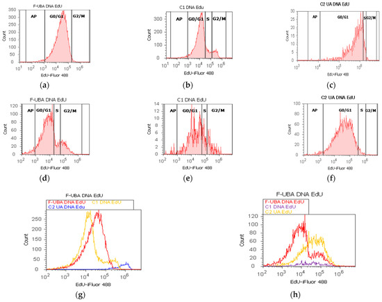 Volumes of 1 mL of both cell cultures were incubated with 50 µM EdU (500 µL) at 37 °C for 2 h. Then, both cell types were fixed with 4% paraformaldehyde in PBS (100 µL) and permeabilized with Triton X-100 (100 µL). After washing in 3% buffer sodium azide (BSA) and centrifuging at 300 rpm for 5 min, at 4 °C, the cells were incubated with a reaction mix (500 µL) for 30 min at room temperature into darkness. Then, they were washed in permeabilization buffer and centrifuged at 300× g rpm for 5 min, at 4 °C. After these procedures, 1 mL FCB was added, and the cells were examined by flow cytometry, using a 488 nm excitation and green emission for EdU-iFluor 488 (BL1).
