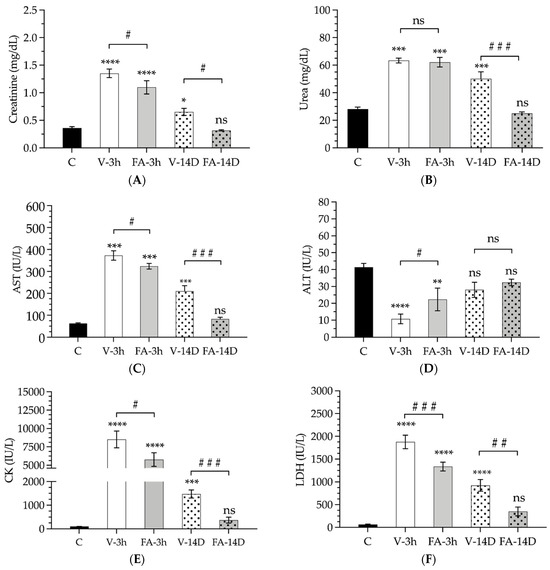Enzyme and electrolyte levels detected in the serum samples collected from the control animals (C, black bar) or animals subjected to ischemia after a period of 3 h or 14 days of reperfusion and treated with folinic acid (FA-3h, smooth gray bars; FA-14D, smooth gray bars) or treated with saline (V-3h, smooth white bars; V-14D, smooth white bars): creatinine (A), urea (B), aspartate transaminase (AST) (C), alanine transaminase (ALT) (D), creatine kinase (CK) (E), lactate dehydrogenase (LDH) (F). Asterisks indicate statistically significant differences compared to the control. Pads indicate statistically significant differences between the untreated animals (white bars, vehicle) and those treated with folinic acid (grey bars, FA) after both 3 h (smooth pattern) and 14 days (dotted pattern). Data are represented as the mean and standard deviation. Statistical significance is accepted with a 95% confidence level (#, *: p < 0.05; ##, **: p < 0.01; ###, ***: p < 0.001; ****: p < 0.0001; ns: p > 0.05).