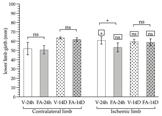 Measurements of the perimeter (in millimeters) of the limb subjected to ischemia (right limb) and the healthy contralateral limb (not subjected to ischemia, left limb), after a period of 24 h (smooth bars) or 14 days (dotted bars) of reperfusion and treatment with folinic acid (FA, gray bars) or saline (V, white bars). The statistical significance levels shown in the squares above the bars show the results of the statistical comparison between the ischemic limbs and the healthy contralateral limbs in the same experimental group (paired analysis). The significance levels shown in the square brackets refer to the comparison between the groups indicated (*: p < 0.05; ns: p > 0.05).