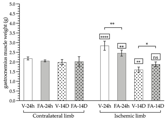Furthermore, it was found that, similar to the results observed in younger rats [52], there was no significant difference in the gastrocnemius muscle weight when comparing the FA and saline treatment groups. Nevertheless, it was observed that FA significantly reduced the perimeter of the ischemic limb compared to the untreated group (11%).