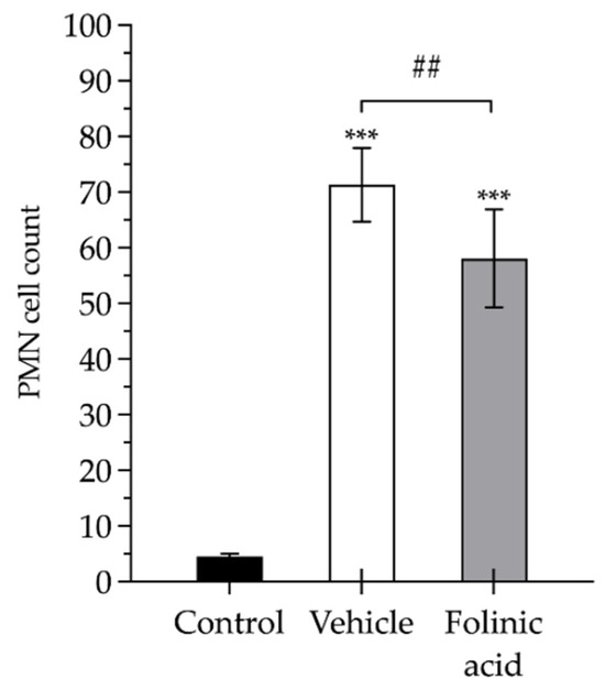 Polymorphonuclear neutrophil (PMN) inflammatory cell count in the gastrocnemius muscles of healthy control animals (control, black bars) and animals subject to 3 h of ischemia and 24 h of reperfusion and treated with saline (vehicle, white bars) or treated with folinic acid (gray bars). The pads show the statistically significant differences between the groups indicated by the upper box (## p < 0.01), and the asterisks show the statistically significant differences compared to the control (*** p < 0.001).