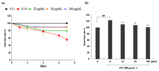 The protective effect of CRHF2 on PM-induced toxicity in zebrafish was evaluated with 25, 50, and 100 µg/mL concentration ranges of CRHF2 due to there being no toxic effect on the embryos. As shown in Figure 6a, the survival rate of embryos was decreased with the treatment of PM compared to the nontreated group. Preincubation with CRHF2 remarkably and dose-dependently increased the survival rate of embryos. Additionally, the heartbeat rate of zebrafish induced with PM was considerably increased compared to the nontreated group (Figure 6b). It was remarkably recovered to normal levels with the treatment of CRHF2.
