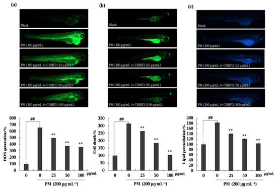 As shown in Figure 7a, the ROS production in PM-induced zebrafish was increased compared to that in nontreated fish. However, CRHF2 treatment at 25, 50, and 100 µg/mL decreased the intracellular ROS levels. Additionally, PM stimulation resulted in significant cell death and lipid peroxidation in zebrafish (Figure 7b,c). Similarly, the results showed a decline in lipid peroxidation and cell death in zebrafish following dose-dependent CRHF2 treatment.