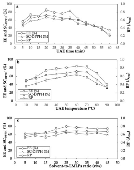 The effect of UAE time (a), extracted at 240 W, 65 °C, and 20:1 (v/w) solvent-to-LMLPs), UAE temperature (b), extracted at 240 W, 20 min, and 20:1 (v/w) solvent-to-LMLPs), and solvent-to-LMLPs (c), extracted at 240 W, 20 min, and 60 °C using ethanol/isopropanol on the EE, SCDPPH⋅, and RP.