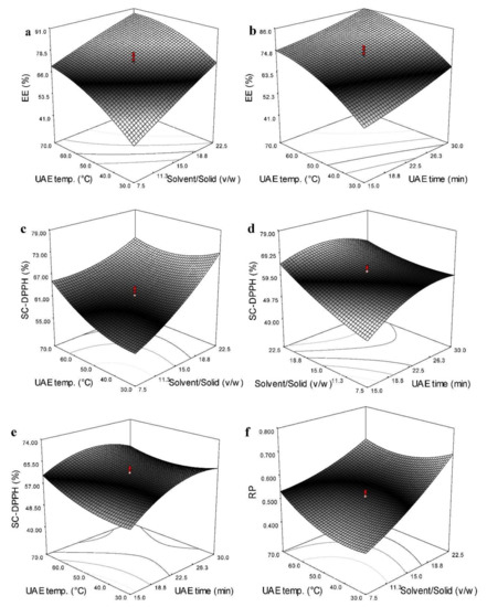 Response surface plots of significant mutual interactions on the EE (a,b), SCDPPH (c–e), and RP (f) of LMO extracted by UAE using ethanol/isopropanol.