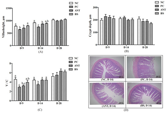 Changes in the intestinal morphology of ducks are shown in Figure 4. Compared with the NC group, the villus height and V/C ratio of the PC group were lower on days 9 and 14 (p < 0.05). The BS group had higher villus height and V/C ratio than the PC group on days 9 and 14 (p < 0.05). The villus height was higher for ducks in the BS group than in the ANT group on day 9 (p < 0.05). There was no significant difference in crypt depth among these four groups. The histological examination showed normal jejunal villous structure for the NC group, disorganized and interrupted and incomplete for the PC group, and to some extent repaired for the BS group.