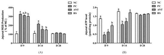 As shown in Figure 5, E.coli infection significantly increased the ROS production of jejunum on days 9 and 14 than the NC group (p < 0.05). The antibiotic supplementation significantly decreased the ROS production on day 14 than the PC group (p < 0.05). B. subtilis treatment significantly reduced ROS production on days 9 and 14 than the PC group (p < 0.05). There was no significant difference in ROS production between the BS and the ANT groups. E.coli infection significantly decreased the ATP level of jejunum on days 9 and 14 than NC group (p < 0.05). While the B. subtilis significantly increased the ATP level than the PC and the ANT groups (p < 0.05). There was no significant difference between PC and ANT groups on days 9 and 14.