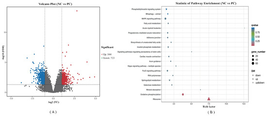 RNA-seq analysis of the jejunum tissue of ducks (PC VS BS). PC–positive group, basal diet with E. coli challenge. BS–basal diet + 2.5 × 109 CFU/kg B. subtilis with E. coli challenge. (A) Volcano plot of differentially expressed genes. X-axis shows log2 (FC) of DEGs between each two groups, Y-axis represents the statistically significant negative logarithm value of the gene expression change; Each point in the volcanic map represents a gene, Red represents increased expression while green represents decreased expression; (B) Dot plot of KEGG pathway enrichment analyses of differentially expressed genes.