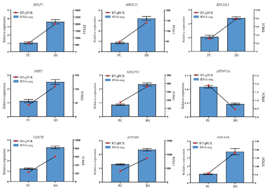 Nine genes involved in pathways of ribosomal (RPLP2, MRPL23, NHP2, RPL22L1) and oxidative phosphorylation (NDUFV1, COX7B, ATP5MF, ATP6V1A, NDUFA6) were selected for validation by RT-qPCR. Their results showed that, compared with PC ducks, B. subtilis increased the expression of RPLP2, MRPL23, NHP2, RPL22L1, NDUFV1, COX7B, ATP5MF, NDUFA6 and decreased the expression of ATP6V1A to varying degrees. The changes in the relative expression levels of the RT-qPCR showed similar trends to the transcriptome-sequencing analyses (Figure 7), suggesting that the RNA-Seq data are reliable.