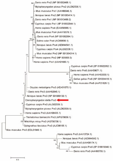 - Liang, X.; Zhu, D.; Li, Y.; Liao, L.; Yang, C.; Liu, L.; Huang, R.; Wang, W.; Zhu, Z.; He, L.; et al. Molecular characterization and functional analysis of peroxiredoxin 4 in grass carp (Ctenopharyngodon idella). Dev. Comp. Immunol. 2021, 125, 104213. [Google Scholar] [CrossRef] [PubMed]