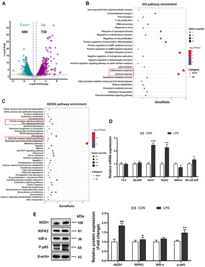 The NOD1/NF-κB signaling pathway was activated in the liver of piglets challenged with LPS. (A) Volcano plots of comparative RNA-seq data between the CON group and the LPS group. (B) GO analysis based on the RNA-seq in the biological process of differential transcripts. (C) Representative KEGG analysis with the transcript corresponding to different genes. (D) The mRNA levels of TLR4, MyD88, NOD1, RIPK2, NFKBIA, NF-κB p65 were evaluated by RT-qPCR. (E) Hepatic protein levels of NOD1, RIPK2, IκB-α, and P-p65 were assessed by western blot, quantified using ImageJ analysis, and normalized to β-actin. n = 4−6 per group. Results are showed as means with SEM represented by a vertical bar. * represents significant differences between the CON group and the LPS group; * p < 0.05, ** p< 0.01, *** p<0.001.