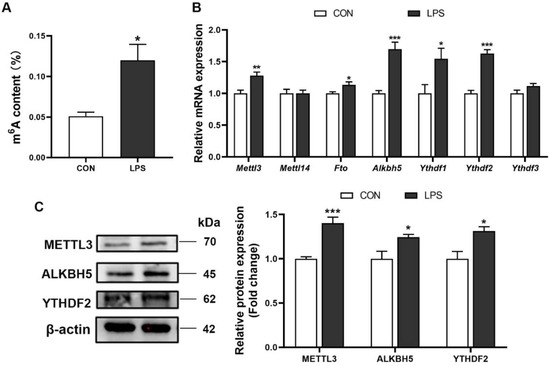 The abundance of m6A RNA methylation in the liver of piglets. (A) The total m6A level was determined by ELISA. (B) The mRNA expression of genes related to m6A modification were measured by RT-qPCR. (C) Hepatic protein levels of METTL3, ALKBH5, and YTHDF2 were evaluated by western blot, and quantification of image density was conducted by ImageJ software. n = 4−6 per group. Results are presented as means with SEM represented by a vertical bar; * represents significant differences between the CON group and the LPS group; * p < 0.05, ** p< 0.01, *** p < 0.001.