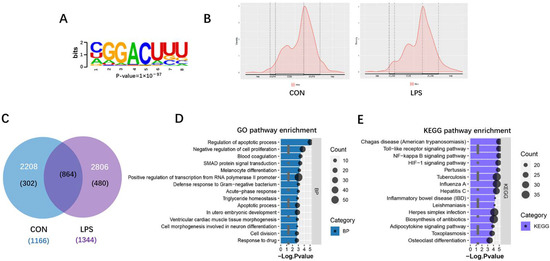 MeRIP-seq of transcriptome in the liver of CON and LPS groups. (A) Consensus m6A motif of the LPS group, as assessed by MEME. (B) Metagene profiles of m6A peaks across mRNA transcriptome. (C) Venn plot showed the differentially expressed m6A peaks and relevant genes in the CON and LPS groups. (D,E) The top 15 GO and KEEG enrichment analyses of m6A-modified genes in the LPS group.