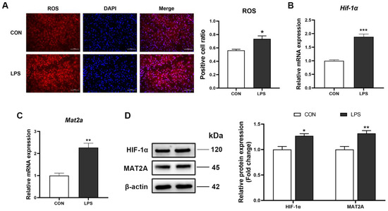 In the present study, we noticed that ROS content was significantly higher in the LPS group compared with the CON group (Figure 6A), suggesting that LPS treatment resulted in the disorder of antioxidant defense systems in the liver of piglets. Moreover, the expression of hypoxic inducible fator-1 alpha (HIF-1α) was also significantly elevated after LPS treatment (Figure 6B,D). It was reported that HIF-1α could promote the transcription of the methionine adenosyltransferase 2 alpha (MAT2A) enzyme, which in turn catalyze the production of methyl donors and enhance cell methylation levels [29,30]. Therefore, we measured MAT2A mRNA and protein levels. The results indicated that the mRNA and protein of MAT2A were remarkably increased in LPS-activated livers compared with control livers (Figure 6C,D).