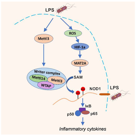 - Cai, Y.; Yu, R.; Kong, Y.; Feng, Z.; Xu, Q. METTL3 regulates LPS-induced inflammatory response via the NOD1 signaling pathway. Cell. Signal. 2022, 93, 110283. [Google Scholar] [CrossRef]