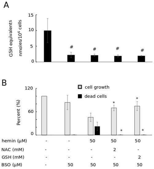 Cells were then co-exposed simultaneously to both hemin and each of the cysteine or GSH (i.e., the natural-origin ones). Cells that were co-exposed to both hemin and alanine, an amino acid without free GSH, served as the experiment controls. Both cysteine and GSH, unlike alanine, reversed completely hemin-induced growth arrest and attenuated hemin cellular content to the level (at ~0.3 nmoles/106 cells, see Figure 3C) recorded in our previous studies as being manageable by cellular detoxification mechanisms, such as HO-1 [29,31]. Therefore, thiols in general and GSH in particular exhibited the capacity to attenuate the intracellular accumulation of hemin to rescue cells from HIC.