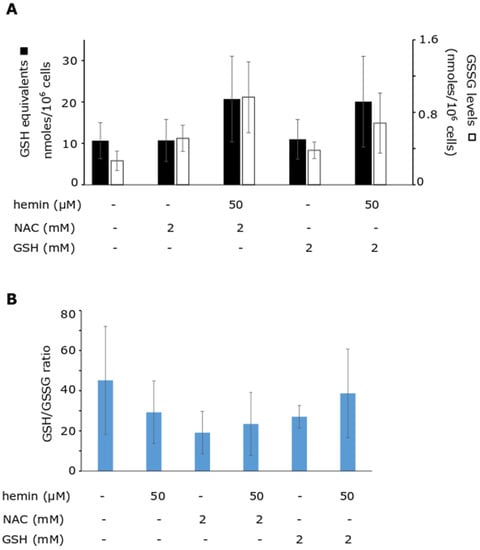 The first scenario was carried out to provethat GSH rescues K562 cells from HIC through the replenishment of the endogenous GSH pool. To investigate this possibility, we determined the intracellular pool of GSH in K562 cells treated exogenously with a molar excess of GSH, in the absence and presence of hemin. NAC, as a donator of cysteine, was used as a known substrate for GSH biosynthesis [43,44]. Neither NAC nor GSH alone increased the cellular GSH equivalents, depicting a negative regulatory loop (Figure 2). Either NAC or GSH, co-added to cells with hemin, increased (doubled) the GSH equivalents over those results observed in cells treated with either thiol alone or with hemin alone (GSH equivalents at 16.99 ± 3.27 nmoles/106 cells, GSSG levels at 0.61 ± 0.22), as published recently by our research group [29,31]. GSH and NAC were able to increase the GSH intracellular content only under the condition of increased GSH biosynthesis attributed to hemin-induced stress. An increase in GSSG was detected, especially in the case of NAC addition. NAC is known to be a weak antioxidant itself [45,46]. However, the largest part of the GSH pool remained in its reduced form (Figure 2). Moreover, the ratio of GSH/GSSG decreased in cells that were treated with either hemin or NAC alone and/or with hemin and NAC, implying an impaired redox status. In the case of exogenous GSH addition, the ratio of GSH/GSSG decreased less prominently, compared with the ratio for untreated cells.